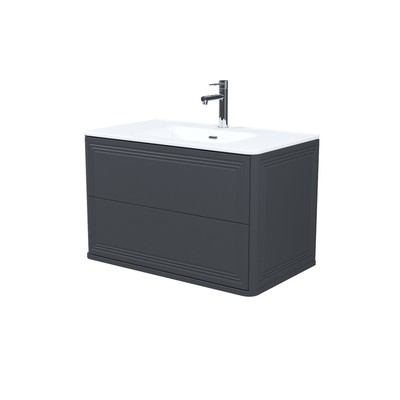 Материал фасадов и боковин – МДФ с покрытием тёмно-серой матовой эмалью (RAL7015). Продумано для использования в помещениях с высокой влажностью и сохранит первоначальный вид мебели надолго (при должном уходе).