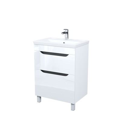 Компактная напольная тумба для ванной Ray с умывальником и выдвижными ящиками – универсальная и практичная мебель, которая будет отлично смотреться в любом современном интерьере. Сочетание белого цвета, светло-серых элементов фасада и тёмно-серых ящиков создаёт стильный дизайн вне времени. У тумбы увеличенная высота, что делает её более вместительной и удобной.